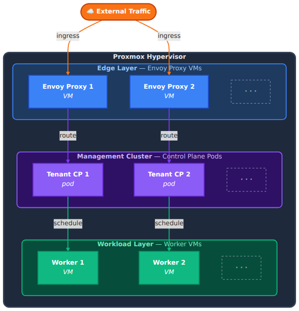 I am building a managed Kubernetes platform called Aether. The idea is that tenants get a kubeconfig and a working cluster and never have to think about the infrastructure underneath. Control planes run as pods via Kamaji, each tenant gets a dedicated Envoy proxy VM, worker nodes run Talos Linux with no shell and no SSH, and everything is provisioned through a custom CAPI provider that talks directly to the Proxmox API.