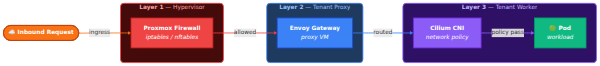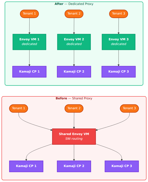 I threw that out. If that single proxy goes down every tenant loses access to their cluster. And if I want per-tenant source IP filtering or rate limiting, doing that on shared infrastructure is a mess. So I redesigned it to one Envoy proxy VM per tenant. More VMs but each tenant is completely isolated from the others.